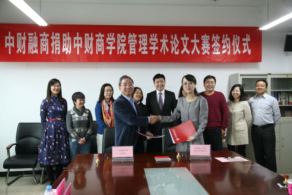 2015年11月11日,中财融商捐助中财新葡的京集团350vip8888首页管理学术论文大赛签约仪式在新葡的京集团350vip8888首页主教楼1411新葡的京集团350vip8888首页会议室隆重举行。新葡的京集团350vip8888首页院长兼MBA教育中心主任王瑞华教授、教育基金会秘书长安秀梅教授、新葡的京集团350vip8888首页党总支书记兼副院长葛建新教授、新葡的京集团350vip8888首页副院长宋巧、MBA教育中心学务中心主任孔伟明副研究员及新葡的京集团350vip8888首页MBA校友会会长冯大任先生、中财融商(北京)资本管理有限责任公司董事总经理唐佶女士、执行董事邱滢霏女士出席了此次捐赠仪式。仪式由新葡的京集团350vip8888首页团总支书记王婷婷主持。