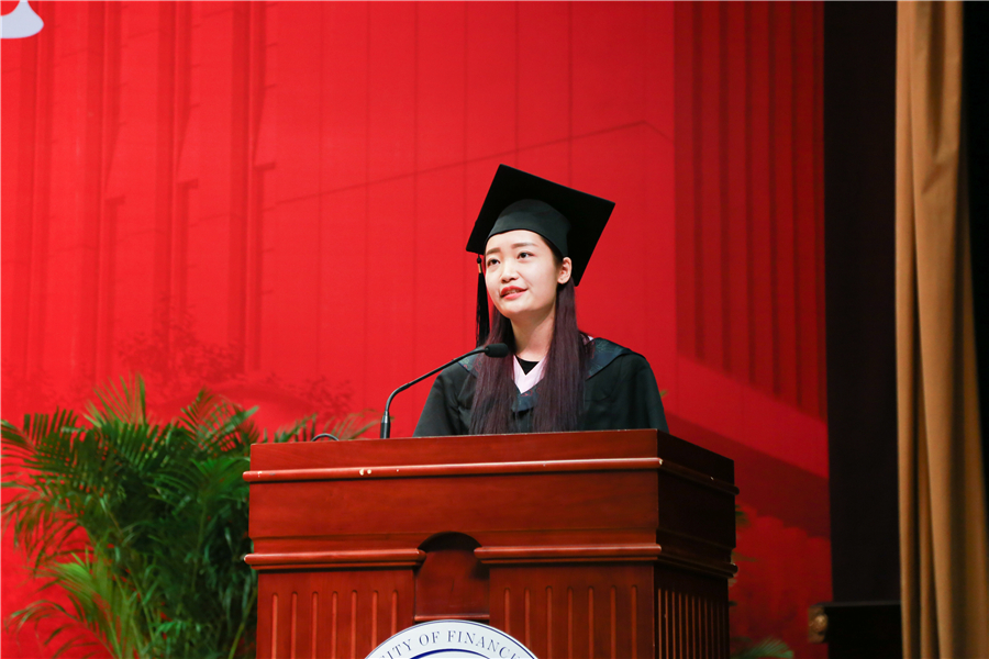 2012级本科生曾戬媛、2014级学术性硕士生蕾拉、2014级MBA硕士生殷丽莉、2013级博士生韩慧林分别作为毕业生代表发表了毕业感言。代表们回顾了难忘的校园生活,衷心感谢老师们付出的心血和汗水,感谢同学们彼此之间的关爱和帮助,感谢亲友们在自己求学之路上的支持!他们表示,作为中财的毕业生,他们一定自觉担负起时代赋予的历史重任和光荣使命,秉承母校“忠诚、团结、求实、创新”的校训,牢记老师们的谆谆教诲,在今后的工作中谱写新的篇章,创造新的辉煌,以骄人的成绩为母校增光添彩,为实现中华民族伟大复兴的中国梦努力奋斗!来自物流管理专业的曾戬媛同学已被美国俄亥俄州州立大学哥伦布分校录取,她的2012级本科同学中还有30位小伙伴也将分赴海外,前往伦敦政治经济学院、纽约大学、新加坡南洋理工大学等国际知名高校深造;而学术型硕士研究生代表蕾拉则是来自非洲马里共和国的留学生,她用流利的中文表达了她对新葡的京集团350vip8888首页、中财新葡的京集团350vip8888首页师生友人们的感谢,要将这份真挚的情谊带回她的祖国!