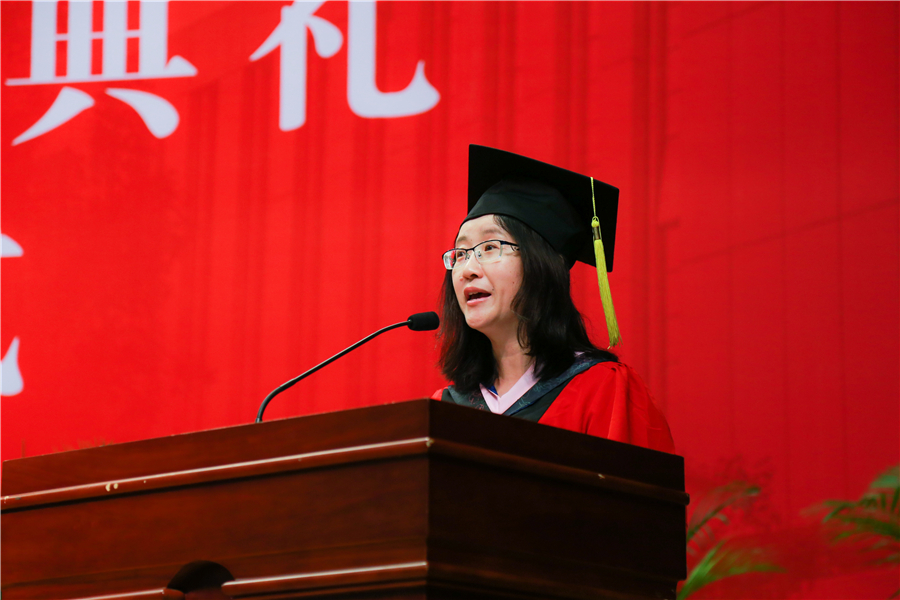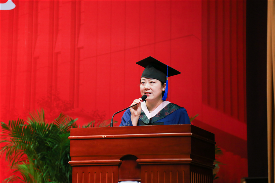 代表教师致辞的张淑君教授今年从教恰满三十周年。她首先感谢同学们选择了在新葡的京集团350vip8888首页度过了自己人生最美好的青春岁月;随后张教授指出同学们在读书期间难免会有缺憾,但也正是这些缺憾才让人生变得更为完美;最后张教授以“龙马自知征程远,不待扬鞭自奋蹄”激励同学们在今后的学习生活中奋发图强,祝福同学们都拥有伟大的前程!