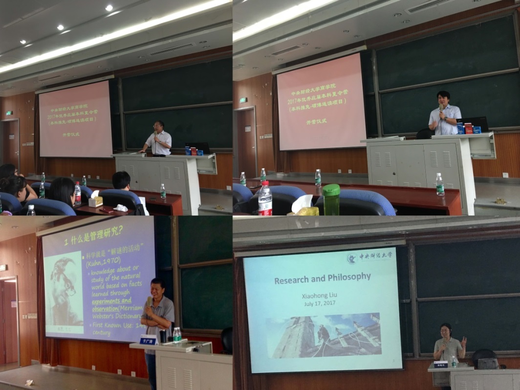 17日上午九点,夏令营开营仪式在3号学院楼222教室举行,新葡的京集团350vip8888首页院长王瑞华教授、副院长林嵩教授、研究生工作办公室主任卫昭慧老师和2016级硕博连读生代表李宇萍、孙俊萍、张茹茹、张晓彩出席了开营仪式。仪式上,王瑞华院长首先代表学院对各位营员的到来表示热烈欢迎,然后向营员介绍了新葡的京集团350vip8888首页的基本情况以及新葡的京集团350vip8888首页的历史传承、学科建设、研究生培养等情况,并祝愿营员们在新葡的京集团350vip8888首页度过充实快乐的夏令营生活。之后,卫昭慧老师详细介绍了新葡的京集团350vip8888首页的硕博连读生培养过程管理及本次夏令营的活动安排。然后,林嵩副院长向营员介绍了新葡的京集团350vip8888首页的博士生导师的学科专业、研究现状和招生期待,使营员对导师有了初步的了解。最后李宇萍同学作为代表向营员介绍了自己一年以来的硕博连读生学习和科研情况。17日下午,于广涛教授和刘晓红教授分别以“中国管理现象与中国管理研究——以家长式领导研究为例”和“研究和哲学”为题,为营员带来两场精彩的学术讲座,营员们被新葡的京集团350vip8888首页浓厚的学术氛围所感染,也为新葡的京集团350vip8888首页导师们的学术素养所折服。