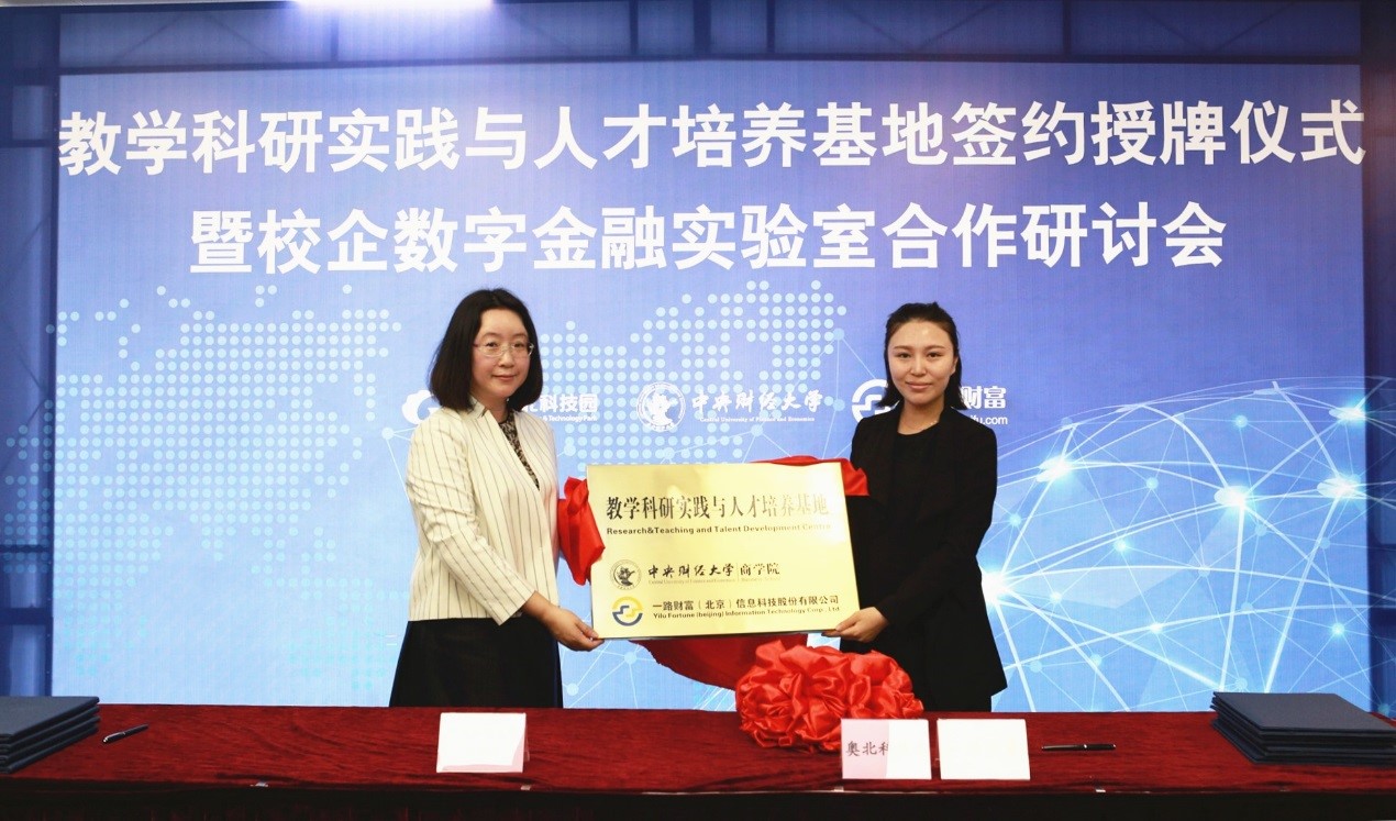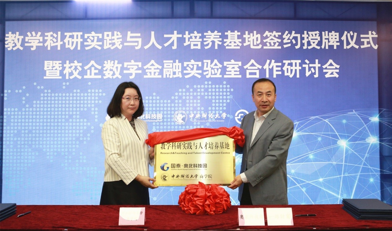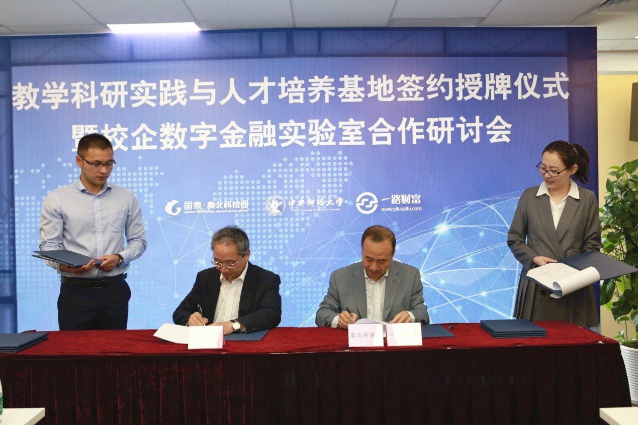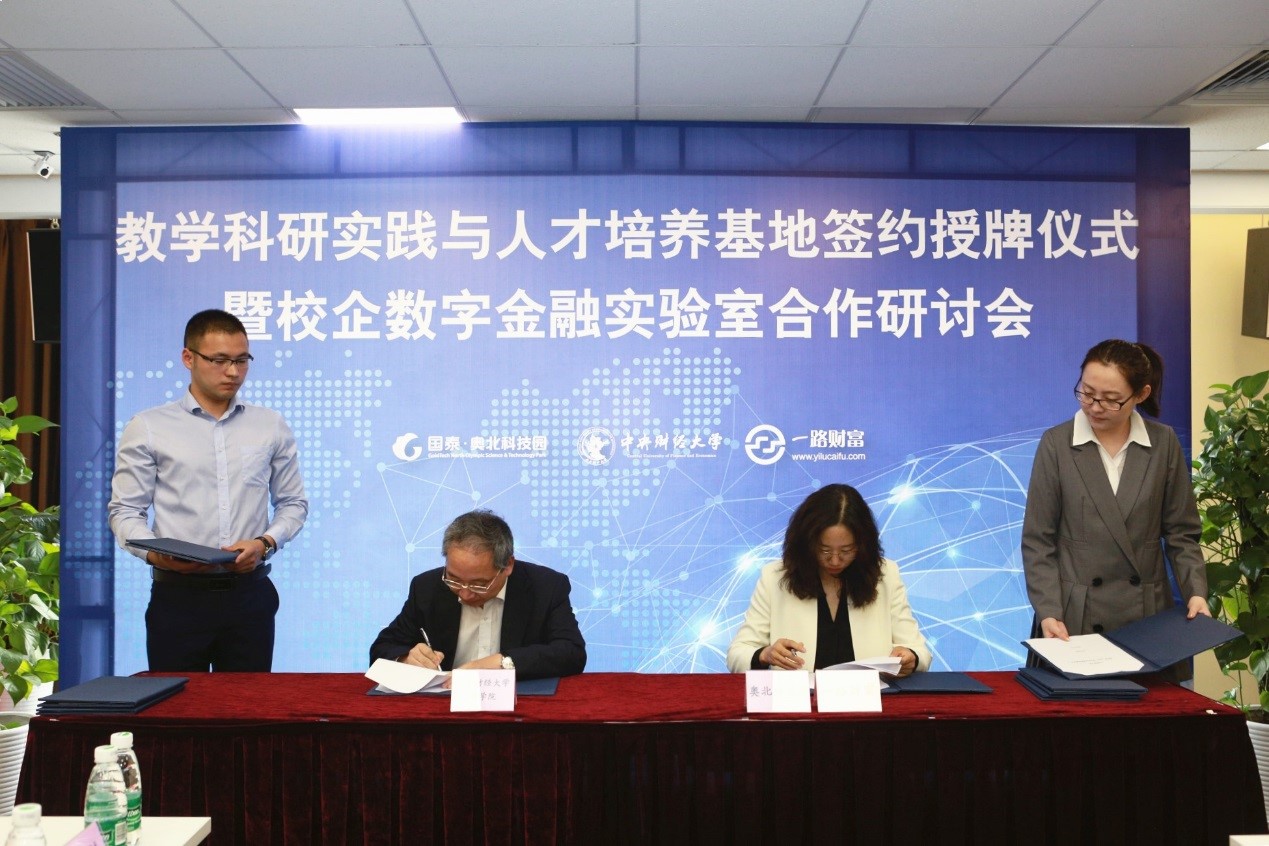随后,王瑞华院长分别与何泽平董事长、吴雪秀副总裁共同签署了国泰集团、一路财富校企合作协议。葛建新书记代表新葡的京集团350vip8888首页向国泰集团、一路财富授予新葡的京集团350vip8888首页教学科研实践与人才培养基地铜牌,并分别与何泽平董事长、张妍总监为教学实践基地揭牌。