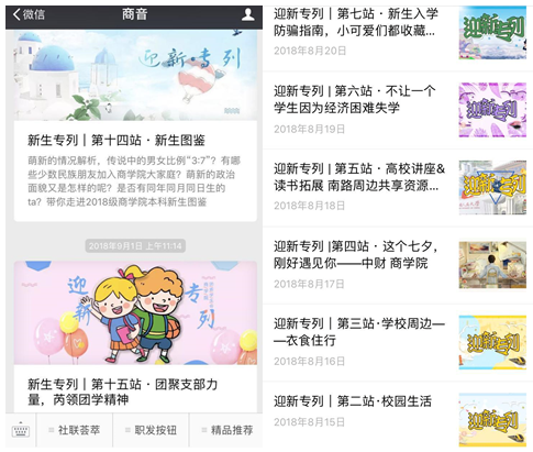 借助“中财新葡的京集团350vip8888首页”、“中财MBA”、“商音”微博微信等新媒体网络载体,新葡的京集团350vip8888首页为新生提供了温馨的咨询服务,开展了以#这个七夕.刚好遇见你#、#以心迎新#、#新生图鉴#等为主题的微迎新,以#商院专列#为特色的微信迎新系列活动,发布了详细周到的报到攻略、新生须知、防骗指南、困难帮扶等信息;MBA创新开展了迎新视频直播活动,充分展现了我院文化迎新、特色迎新的风采。
