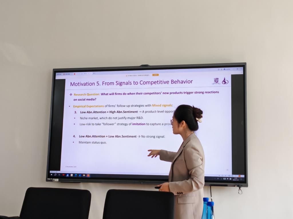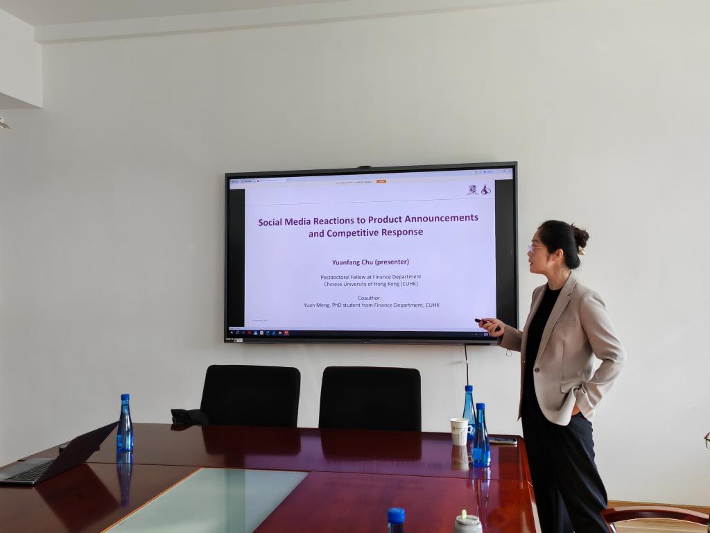 The theme of Dr. Chu Yuanfang’s lecture was "Social Media Reactions to Product Launches and Competitive Responses". Based on data from a major social media platform, she empirically examined whether firms’ product market strategies are related to the social media reactions triggered by competitors’ product launches. The study found that product launches significantly boost the intensity of social media discussions. When competitors’ new products receive strong attention (especially positive sentiment), firms adjust their own product supply to a greater extent in the following year. Further analysis showed that high attention is associated with greater product differentiation, while under moderate attention, positive sentiment drives product supply convergence. These effects remain robust after controlling for other information channels, product market dynamics, and firm characteristics. Dr. Chu argued that social media, as a real-time and crowdsourced external information source, can reflect the consumer base and new product preferences—a mechanism that is particularly prominent in product-related discussions and market-oriented industries. Her research provides important evidence for understanding how the information environment in the digital age reshapes firms’ competitive strategies.